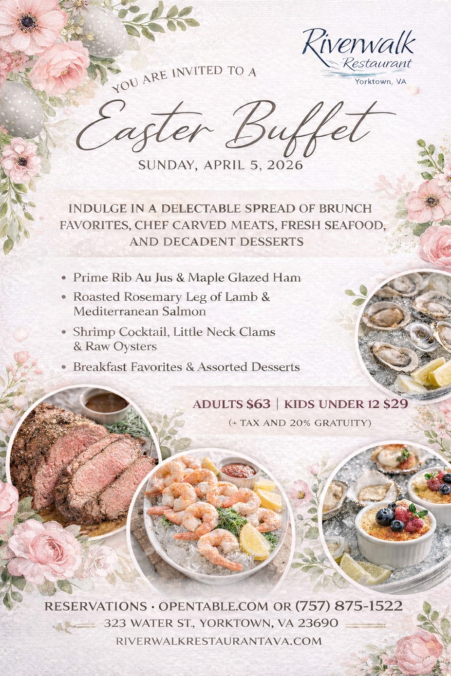 Enjoy freshly prepared brunch favorites, premium carving stations, and seafood selections while overlooking the York River. From warm pastries and Belgian waffles in the morning to slow roasted meats and decadent desserts throughout the afternoon, our Easter Buffet is designed to offer something for everyone at the table.