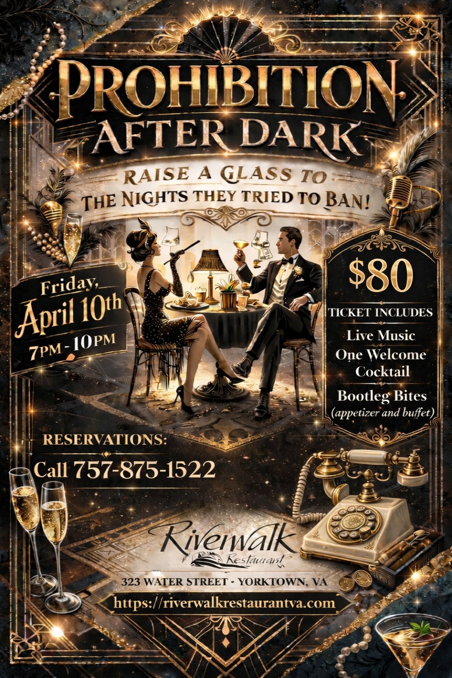 Step beyond the ordinary and slip into the shadows of the roaring twenties at Prohibition After Dark, where we raise a glass to the nights they tried to ban. On Friday, April 10th from 7PM to 10PM, Riverwalk Restaurant transforms into a hidden speakeasy filled with live music, flowing cocktails, and an air of vintage glamour. For $80 per guest, your ticket includes live entertainment, one welcome cocktail, and Bootleg Bites featuring curated appetizers and buffet selections, along with access to the dance floor once the band begins to swing. Guests are encouraged to arrive dressed in their finest 1920s attire, from tailored suits to flapper dresses, as the evening calls for style, sophistication, and just a hint of mischief.