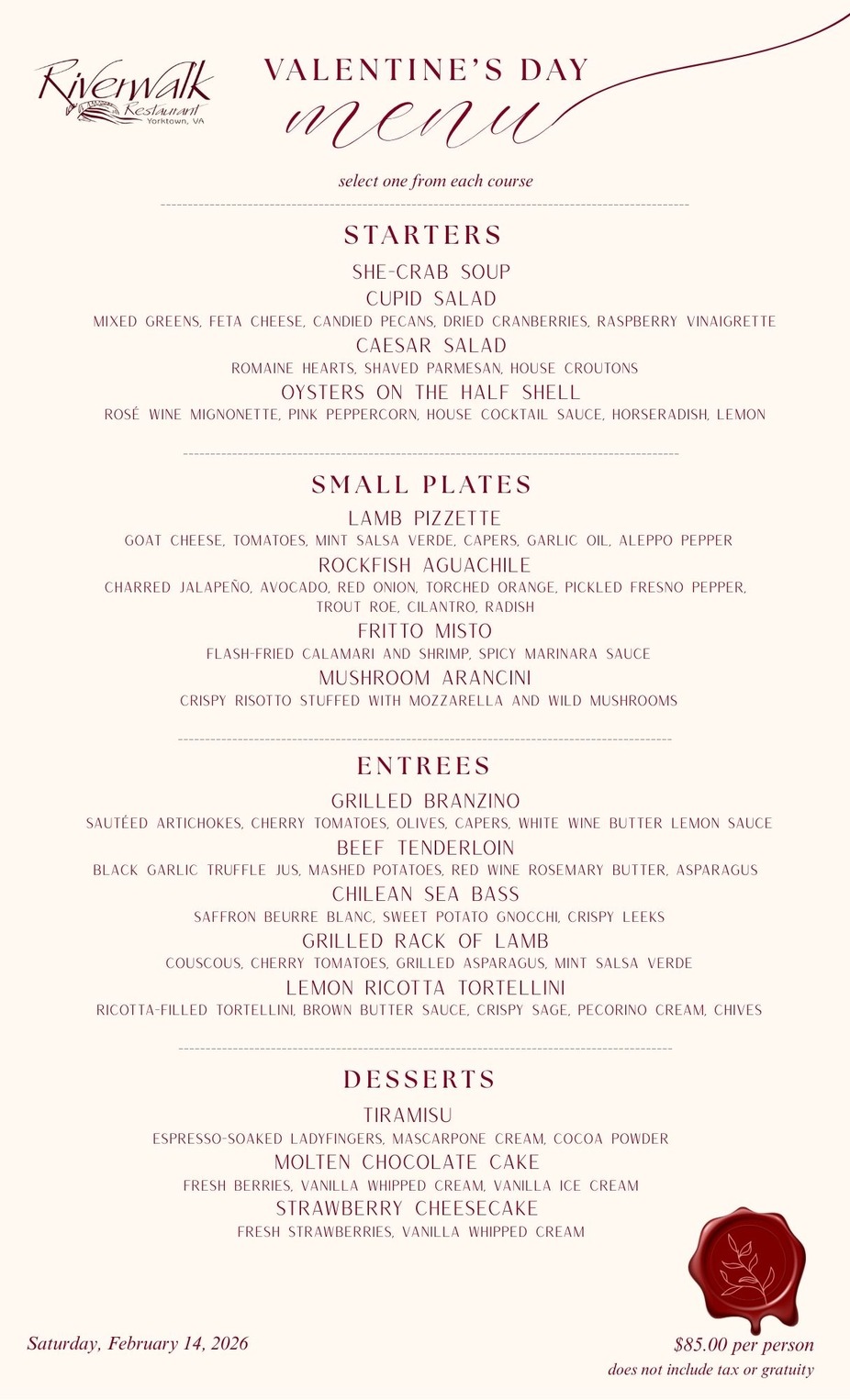 Join us on Valentine's Day for the perfect romantic evening! Prix Fixe Menu- $85.00 per person (does not include beverages, tax, or gratuity).